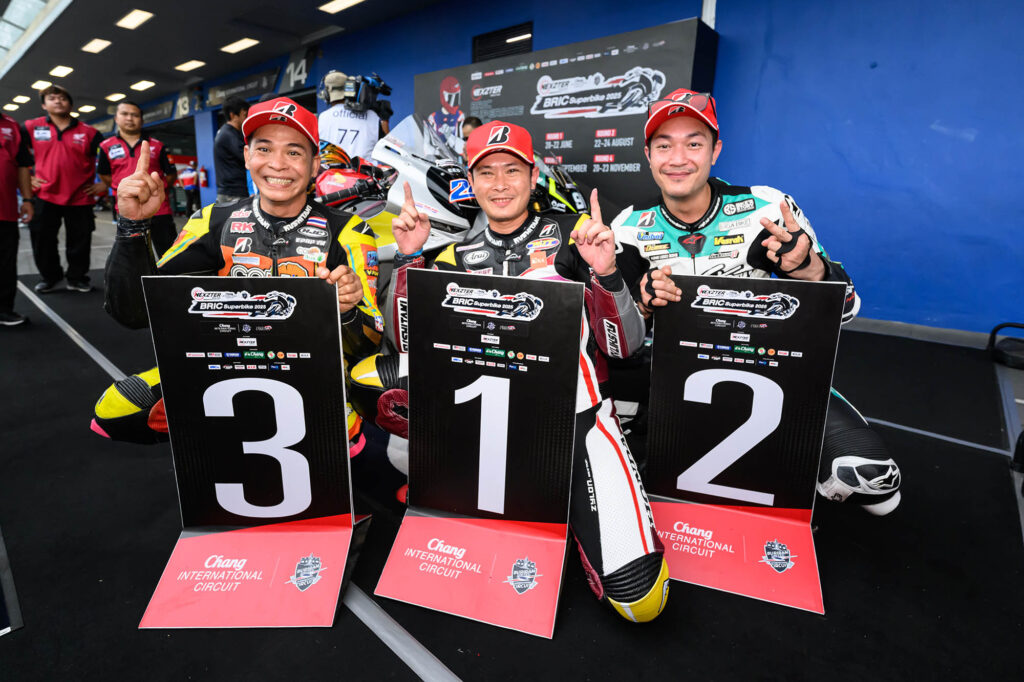เกมในรุ่นใหญ่อย่าง ซูเปอร์ไบค์ 1,000 ซีซี (SB1 Pro) ซึ่งเป็นไฮไลต์ของสุดสัปดาห์นี้ ยังคงเข้มข้นสุดๆ โดยตำแหน่งโพลสนามนี้เป็นของ “แสตมป์” อภิวัฒน์ วงศ์ธนานนท์ จอมเก๋าจาก อีสต์ เอ็นเจที เรซซิ่ง ทีม ขนาบข้างด้วย “ซุป” อนุชา นาคเจริญศรี จาก โปร ฮอนด้า บริดจสโตน อันเดรียนี เบนดิกซ์ เอเอ็น เรซซิ่ง ทีม และ “บอล” จักรกฤษณ์ แสวงสวาท จาก ไบค์สตอรี พีทีที ลูบริแคนท์ส ยามาฮ่า เรซซิ่ง ทีม ในแถวหน้า ขณะที่ “มิกซ์” ธนัช ละอองปลิว นักบิดดาวรุ่งจาก อิเดมิตสึ ฮอนด้า ทีม คริสมาส ออกตัวจากแถว 2