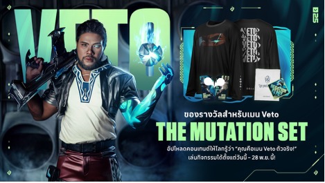 ร่วมสนุกได้ตั้งแต่ วันนี้ – 28 พฤศจิกายน 2568 และลุ้นรับของรางวัลสุดเอ็กซ์คลูซีฟจาก VALORANT อย่าง The Mutation Set กับของรางวัลสุดเท่ในสไตล์ Veto รวม 50 รางวัล ภายในเซ็ตประกอบด้วย