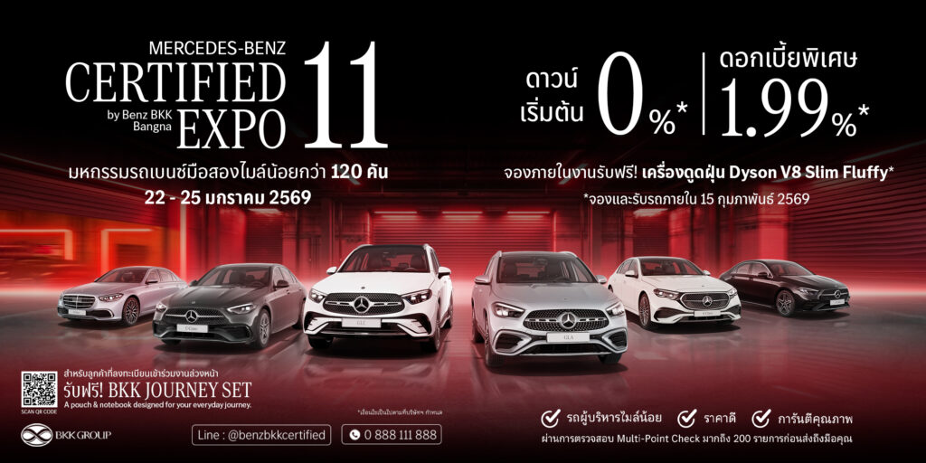 มหกรรมสุดยิ่งใหญ่ Mercedes-Benz Certified by Benz BKK Bangna EXPO ครั้งที่ 11 จัดขึ้นระหว่างวันที่ 22–25 มกราคม 2569 (4 วันเท่านั้น) ณ Benz BKK Bangna พร้อมบริการอาหารและเครื่องดื่มฟรีตลอดงาน นับเป็นอีกหนึ่งกิจกรรมสำคัญที่ตอกย้ำความเป็นผู้นำตลาดรถเบนซ์มือสองจากศูนย์ ด้วยขนาดงาน คุณภาพรถ และประสบการณ์ที่ “ให้มากกว่านี้ ไม่มีอีกแล้ว”
