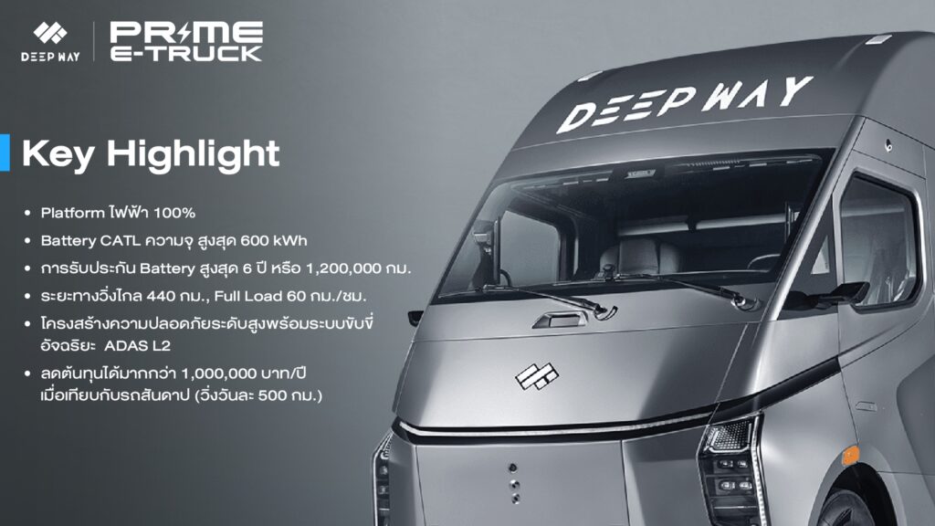 • Prime E Truck จับมือ DeepWay เป็นผู้จัดจำหน่าย รถหัวลากไฟฟ้าอัจฉริยะ DeepWay แต่เพียงผู้เดียวในประเทศไทย พร้อมลงนามความร่วมมือพลิกโฉมโลจิสติกส์ไทยจากระบบดีเซลสู่ระบบพลังงานไฟฟ้า